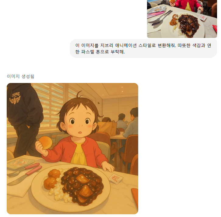 - 예: “이 이미지를 지브리 애니메이션 스타일로 변환해줘. 따뜻한 색감과 연한 파스텔 톤으로 부탁해.”