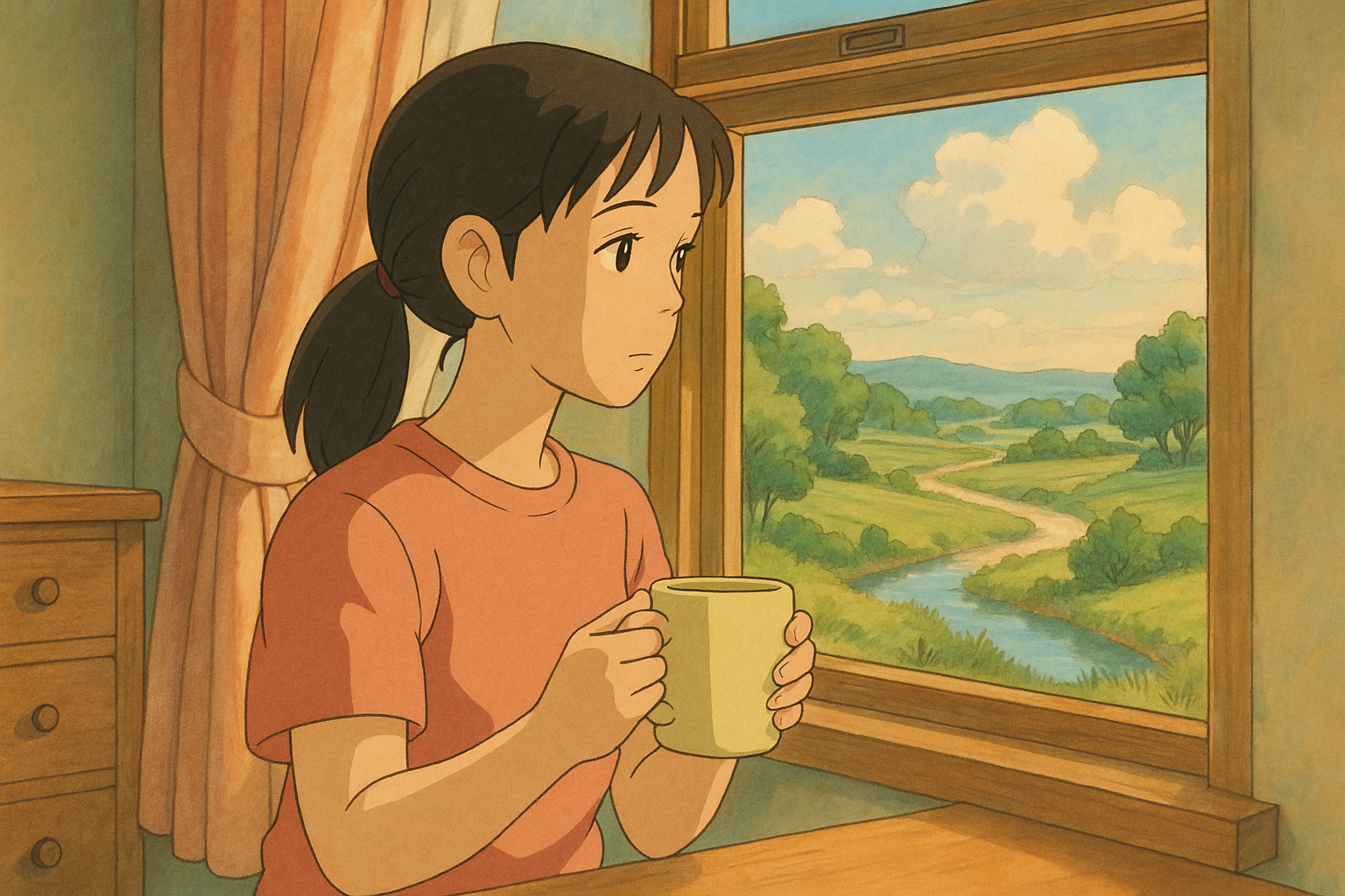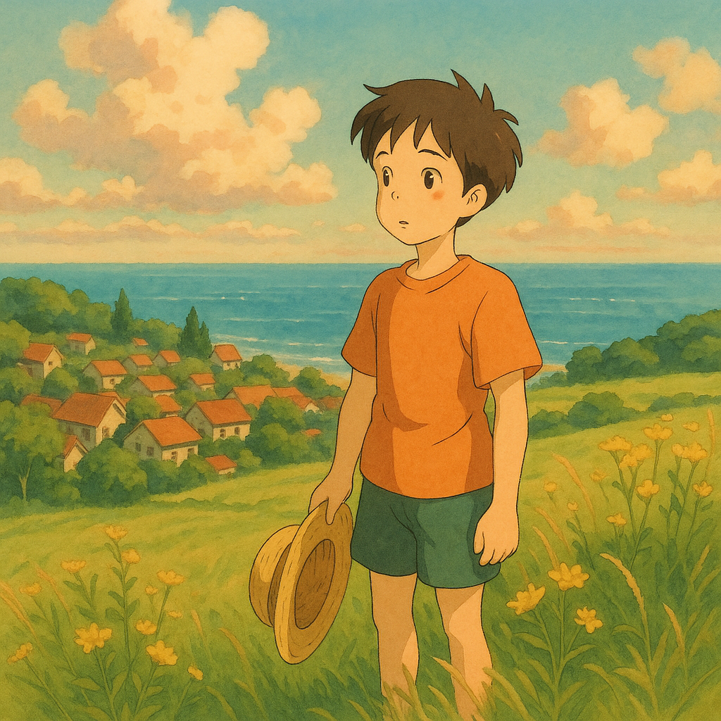 “맑은 하늘 아래 들판 위에서 소녀가 강아지와 걷는 장면을 ‘이웃집 토토로’ 같은 지브리 스타일로 표현해줘. 색감은 따뜻하고 부드럽게.”