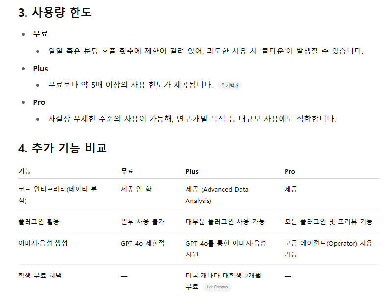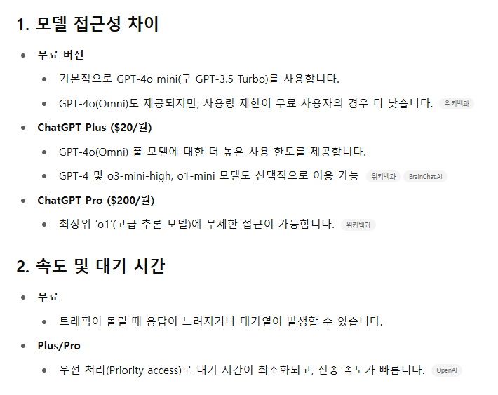 - 무료와 차이점: GPT-4 모델, 파일업로드, 이미지 인식, 정확도 및 길이 유지