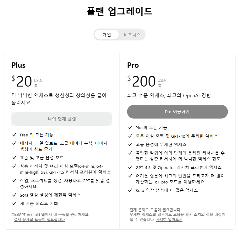 결국 “더 나은 퀄리티를 얻으려면 투자해야 하나?”라는 결론에 도달했고, 한 달만 써보자는 마음으로 챗GPT Plus(유료)에 가입했습니다.