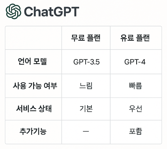 유료버전인 GPT Plus는 GPT-4 모델을 사용할 수 있어서 더 정교한 답변이 가능하답니다. 또, 속도도 더 빠르고 접속 안정성도 높아요. 반면 무료버전은 GPT-3.5만 제공되고, 사용자 폭주 시엔 대기시간이 생길 수도 있어요. 하지만 일상적인 용도로는 무료버전도 충분하다는 게 제 생각입니다.