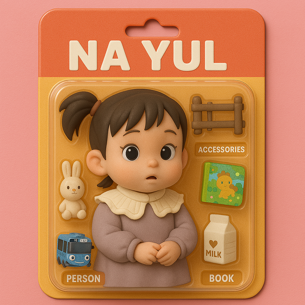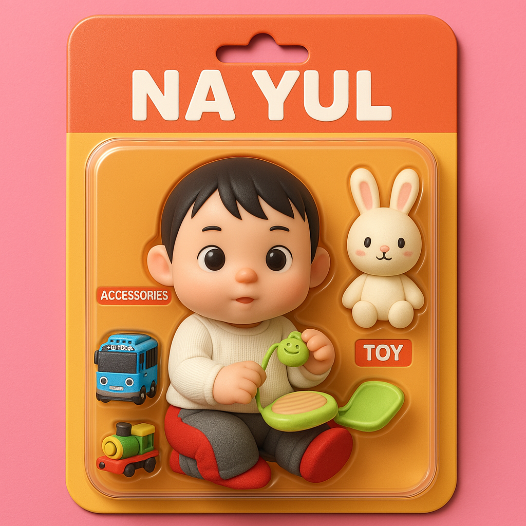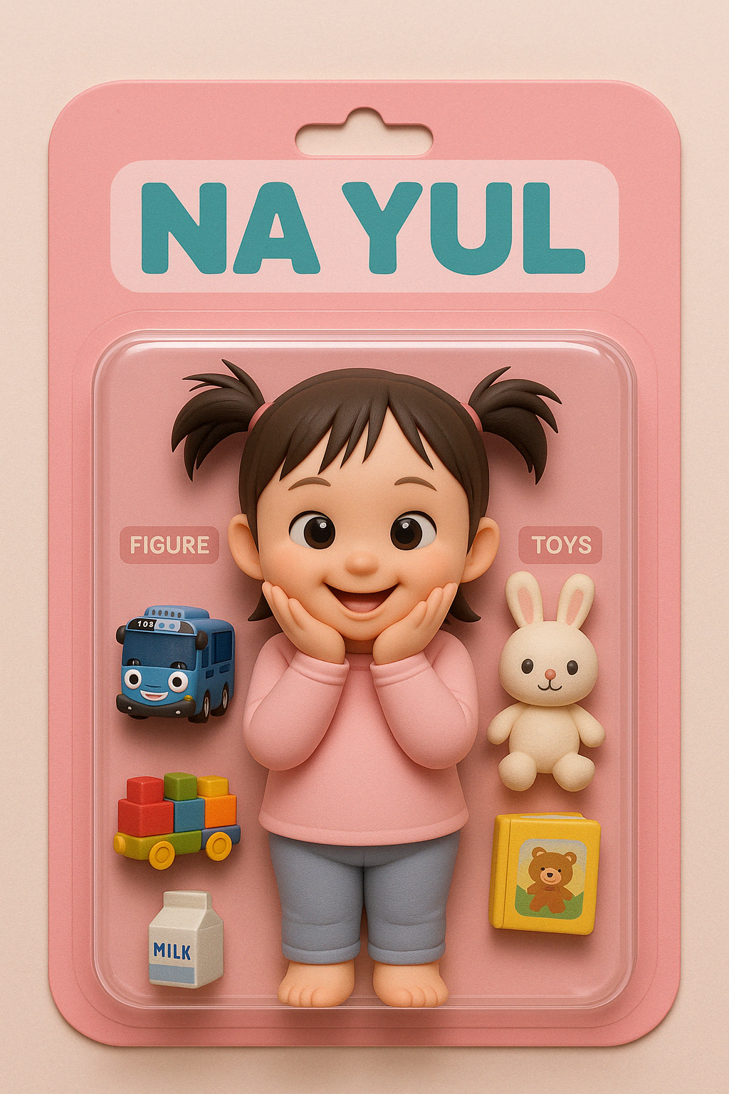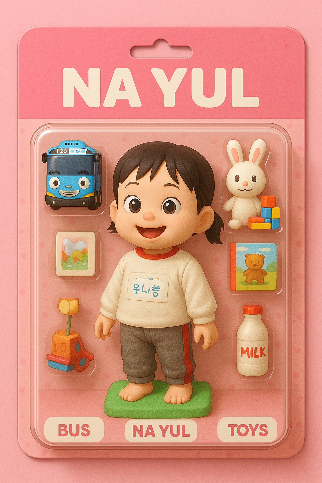 "이 사진을 귀여운 3d 캐릭터 피규어로 바꿔줘 그리고 장난감 스타일의 블리스 터 패키지로 만들어줘 박스 상단엔 NA YUL 적어주고 배경은 핑크로 해줘 소품과 사람은 라벨링 되어 있는 각각 의 칸에 들어있서! 사람은 중간에 두고 양옆에 타요버스, 기차장난감, 토끼인형, 장난감, 동화책, 우유를 배치해줘"