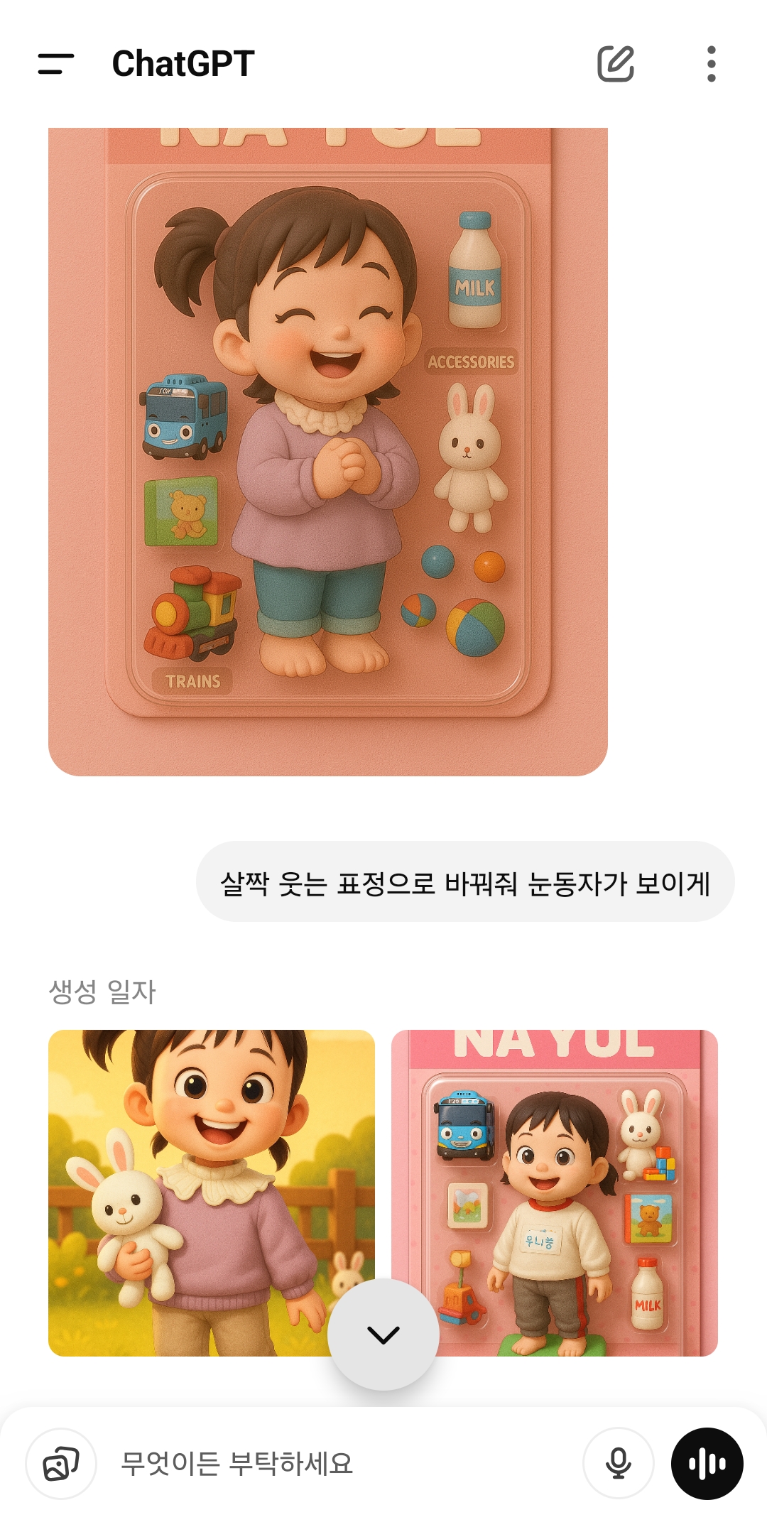 저는 인형을 바꾸고, 웃는 표정을 요청해서 더 밝은 이미지로 다듬었어요. 간단한 편집만으로 퀄리티가 확 올라갑니다! 🚀