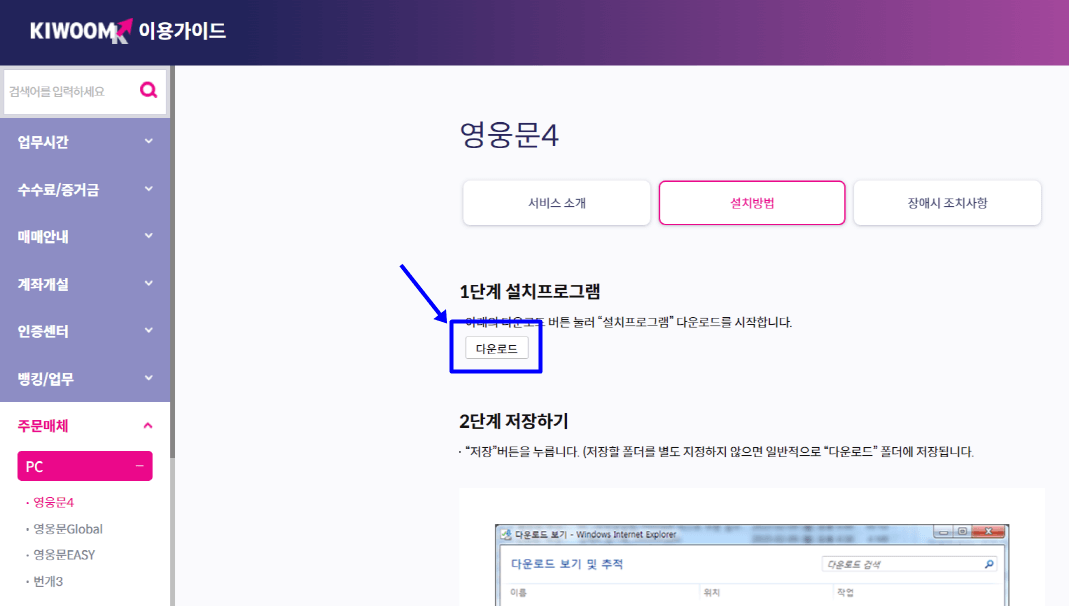 키움증권 홈페이지에 로그인하기 위해 보안프로그램을 설치합니다. 사용 신청은 주말에도 가능하나 오전 7시부터 오후 10시까지 신청이 가능합니다.