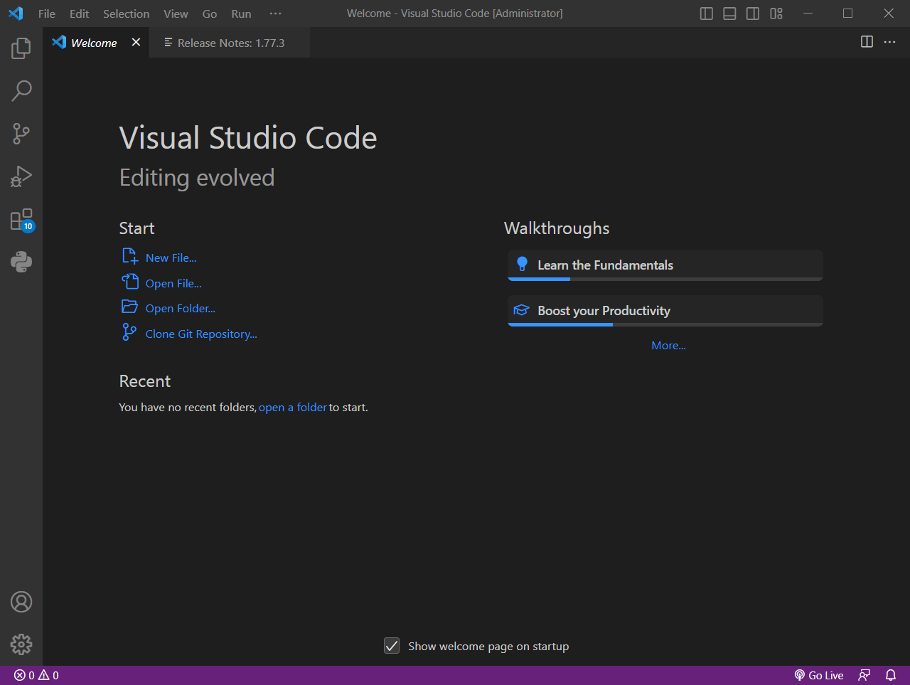 설치 완료 후 VS Code를 실행하였을 때 위와 같은 화면을 확인하실 수 있습니다.